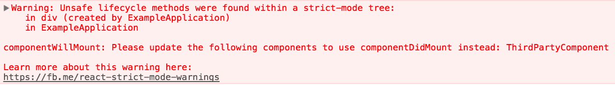 Wenn der strikte Modus aktiviert ist, erstellt React eine Liste aller Klassenkomponenten mit den unsicheren Lifecycles und protokolliert eine Warnmeldung mit Informationen zu diesen Komponenten wie folgt: